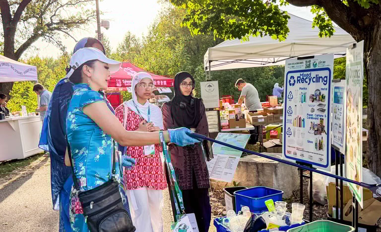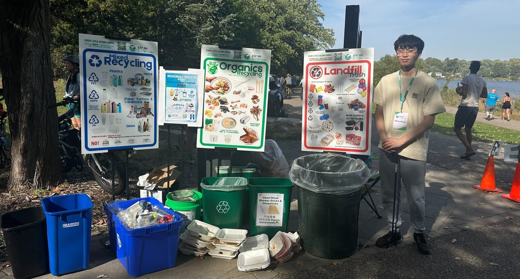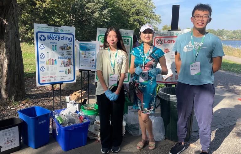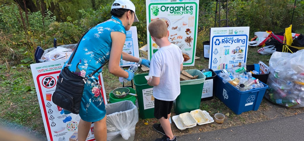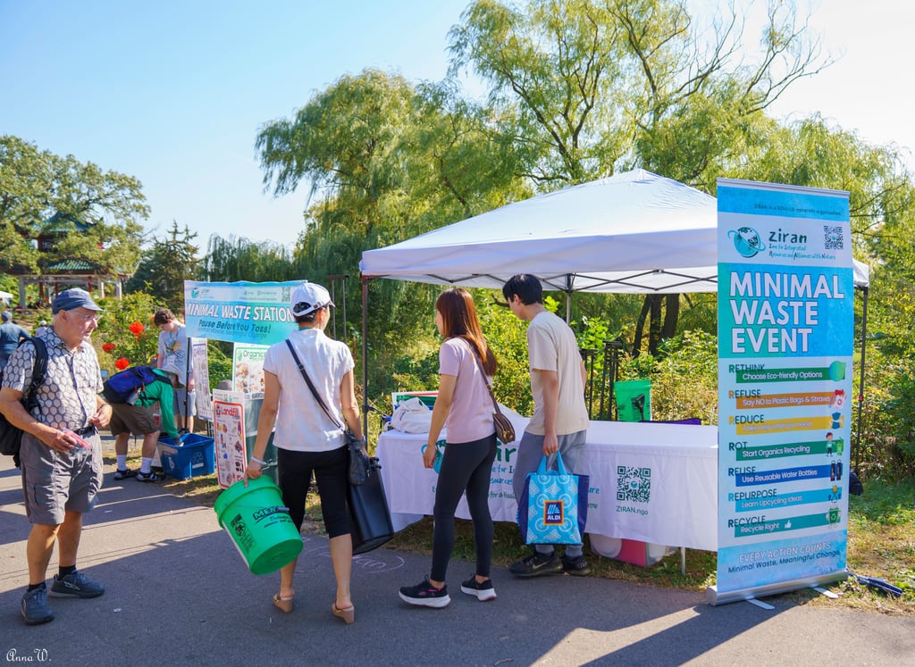 ZIRAN’s co-founders, Jing Li and Grace Li, set up two Minimal Waste Stations. These were positioned near the main stage and food vendors. Volunteers included several Rosemount high school students, a mother and daughter who had just moved to Minnesota from Japan, and a few community members. They helped festival attendees sort their waste into compost, recyclables, and landfill waste.