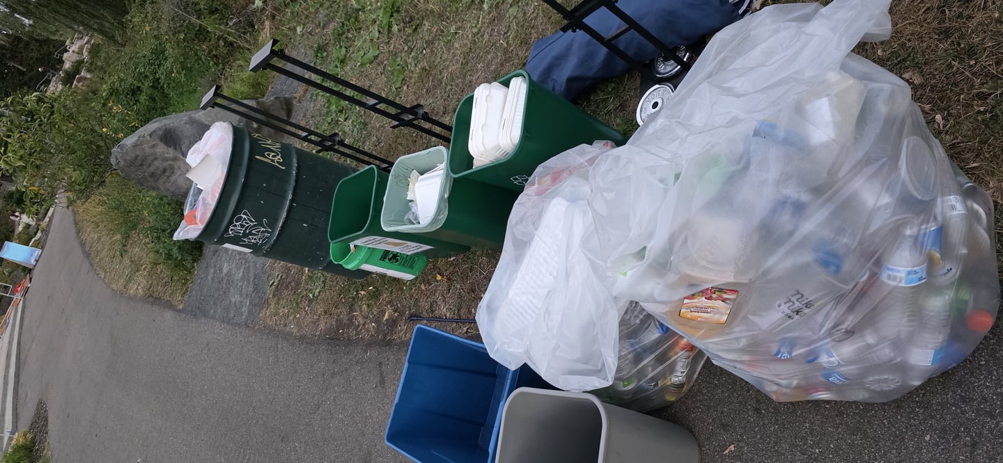5 large bags of recyclables. These recyclable materials would have occupied even more space, but the volunteers thoughtfully stacked many of the recyclable cups and containers to save space.