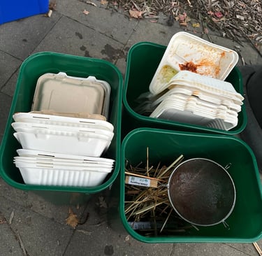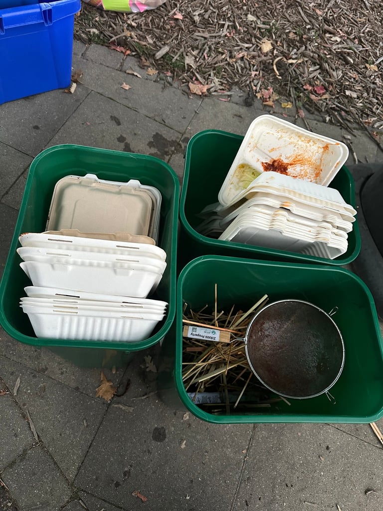 5 bags of compostables. Compostable food boxes were stacked in a fashion similar to the recyclable cups and containers.