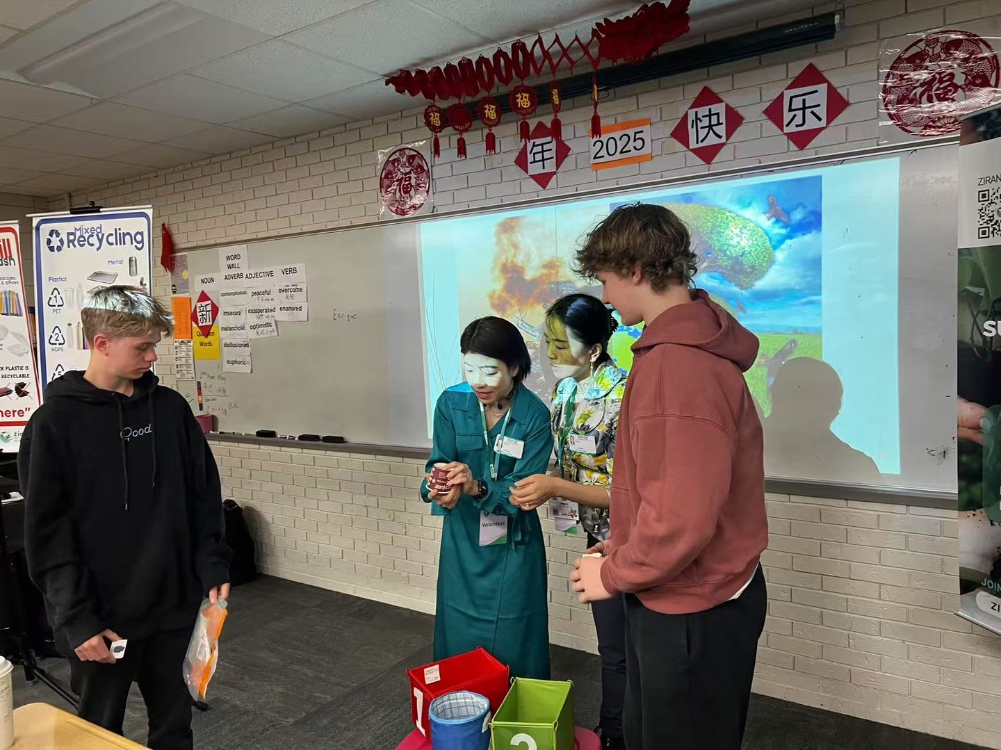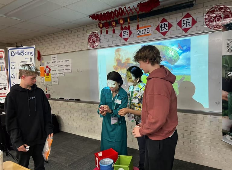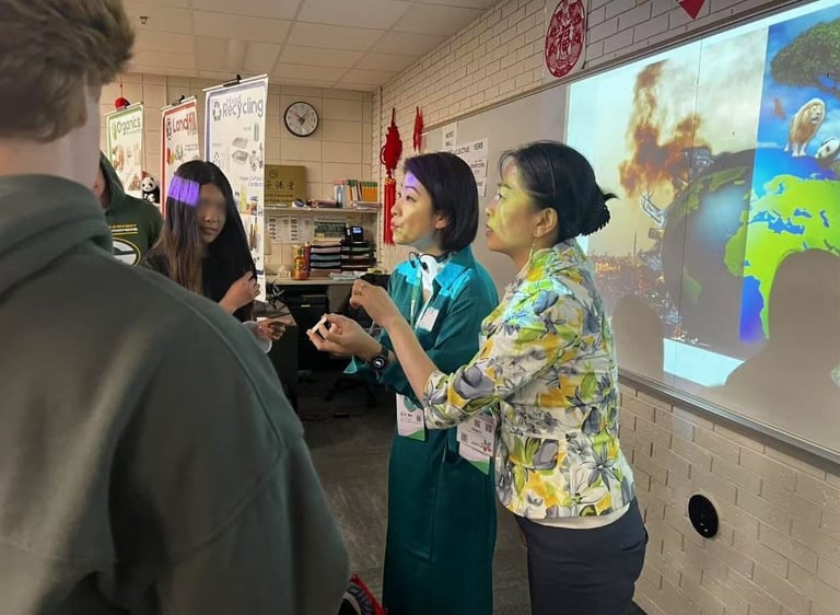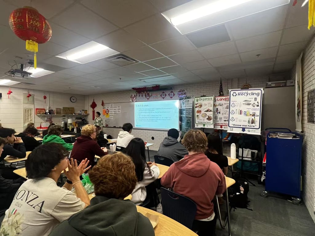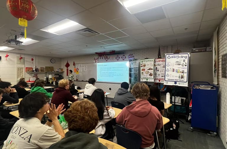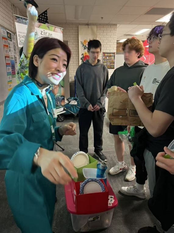 Although the class period was only 44 minutes, Jing and Grace effectively adapted their presentation to create a dynamic and impactful learning experience. Using real-world examples of climate change impacts and extreme weather events, they helped students make connections between global environmental challenges and their daily lives. Through hands-on activities with recyclable and compostable items, students explored practical actions they can take to promote sustainability and were inspired to recognize the urgent need for collective action.