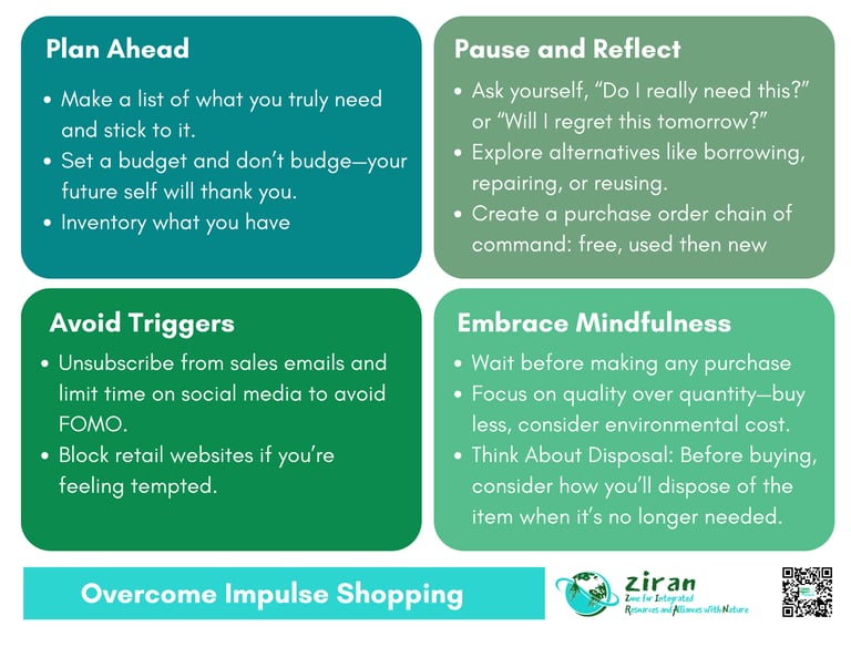 Resist Overconsumption: Stay away from impulsive, unplanned spending and let your money go toward what’s genuinely important. Choose products that are high-quality, durable, and repairable; resist limited-time offers and reduce waste. Support local businesses so that money circulates within the community, creating a positive cycle.