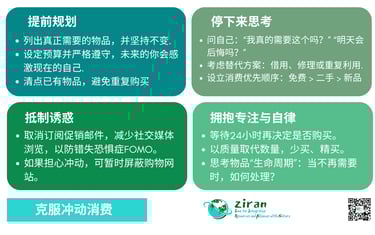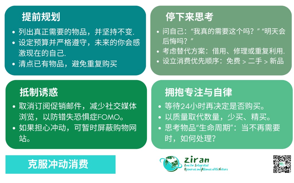 抵制过度消费: 远离冲动购物与无计划支出,让金钱用在真正重要的地方。选择高质量、耐用、可修复的产品,拒绝限时折扣诱惑,减少浪费。支持本地企业,让经济回流社区,形成良性循环。