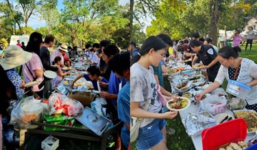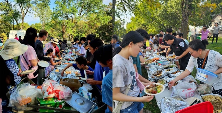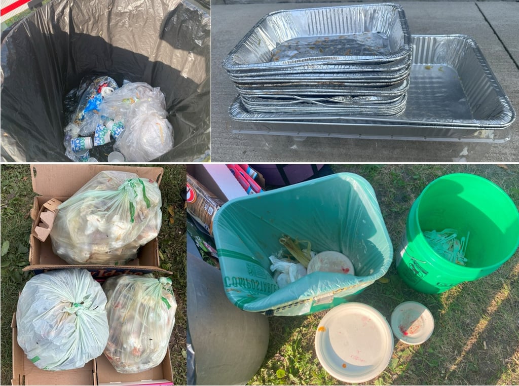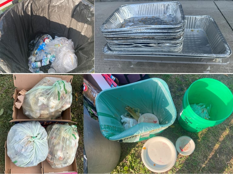 Thanks to everyone’s collective effort, this gathering of 200 people produced less than half a bin of landfill trash. Instead, the guests diverted the day’s waste into one bin of recyclables, three full bags of food scraps, and one bag of compostable plates, which were neatly stacked to save space. Additionally, compostable forks and chopsticks were separated to avoid tearing the bags, and aluminum pans were rinsed and stacked for recycling. Ultimately, the event achieved a waste diversion rate of over 70%.