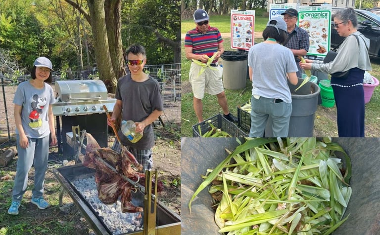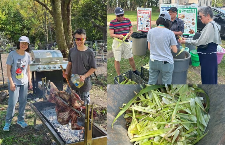 As guests arrived, some helped start roasting a whole lamb while the host shared sweet glutinous corn from his own fields. Many volunteers were excited to help with the husks. At the farm, corn husks that people in the city would usually throw away are collected to feed the animals.