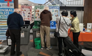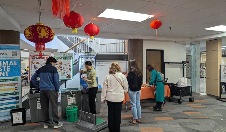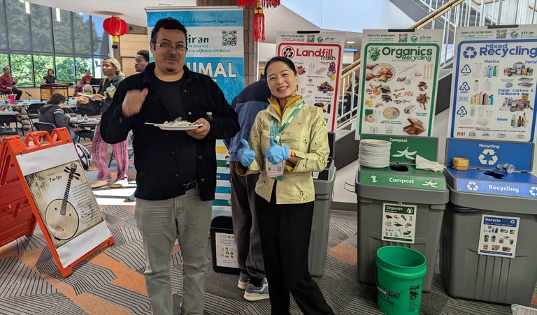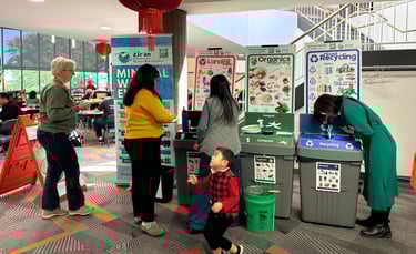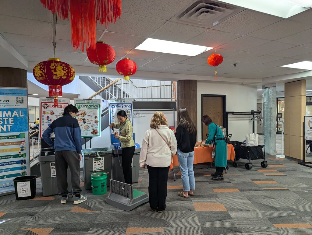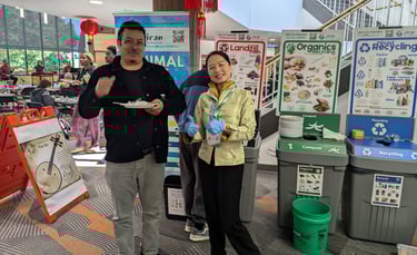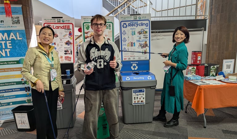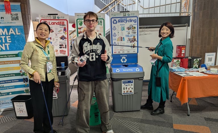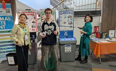 Before the program started at their Minimal Waste Station, Jing Li and Grace Li teamed up to explain to a student volunteer, Ethan, the differences between landfill, organic recycling, and mixed recycling bins. They also showed him how to undo cross-contamination in the three bins