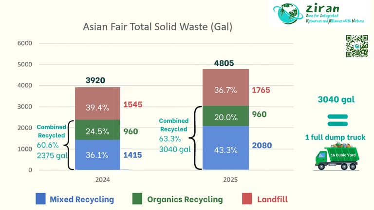 Altogether, there were 4,805 gallons of waste from the Asian Fair, a 22.6% increase in waste volume compared to 2024. But the majority did not go into landfill. ZIRAN and volunteers helped the fair’s businesses and attendees achieve a 63.3% diversion rate, sending only 1,765 gallons to landfills, diverting nearly twice as much. Moreover, the 63.3% diversion rate increased from the 60.6% diversion rate in 2024. While the percentage increase may seem modest, the sheer volume prevented from going to landfill is remarkable.