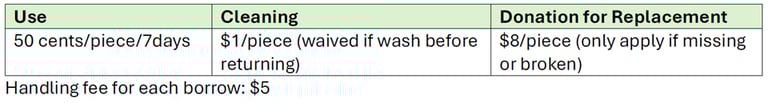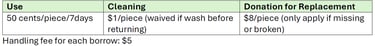 Cleaning: $1/piece (waived if wash before returning)
